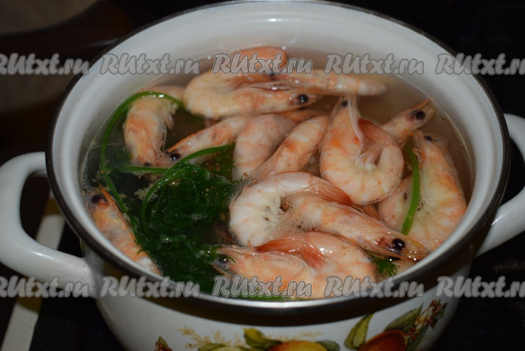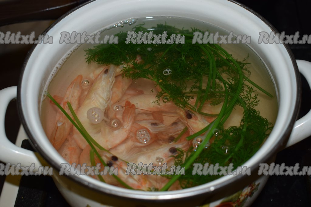 С момента закипания засекаем 3 минуты и выключаем огонь. Сливаем воду, убираем укроп и даём креветкам остыть.
