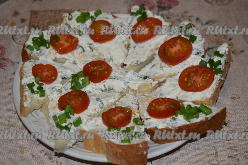Далее каждый кусочек хлеба смазываем подготовленной творожной намазкой (примерно, по 1 чайной ложке на каждый кусочек хлеба). Нарезаем зелёный лук мелко, а помидорчики черри - на кружочки. Посыпаем луком каждый бутерброд и выкладываем по кружочку помидора.