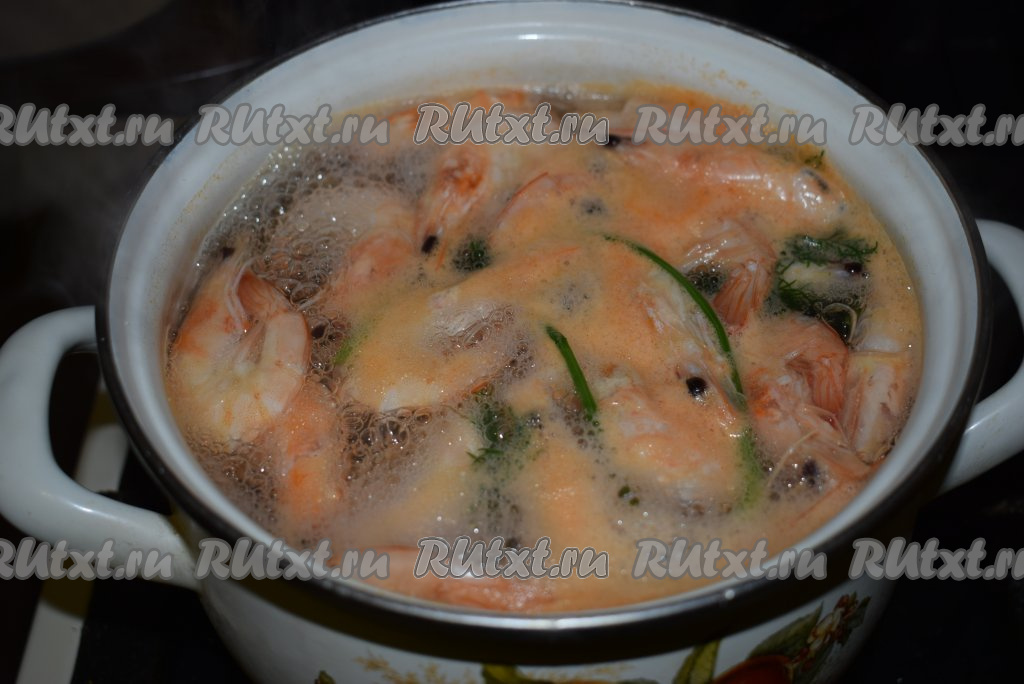 Доводим воду с креветками на среднем огне до закипания (креветки начнут всплывать вверх кастрюли).