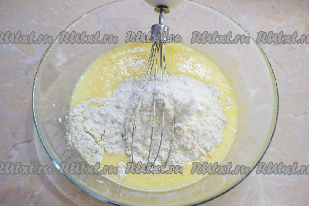 Муку просейте через сито, чтобы насытить её кислородом. Это благотворно влияет на готовую выпечку и она получается наиболее воздушной. Добавьте в тесто просеянную муку и хорошо вмешайте в лимонное тесто, чтобы не осталось комочков.