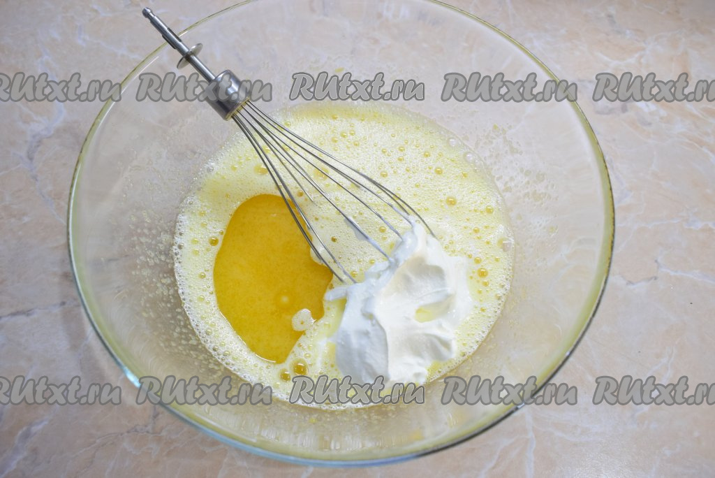 К яйцам, смешанным с сахаром, добавьте растопленное негорячее сливочное масло, растительное масло, сок лимона и сметану, перемешайте тесто до однородности.