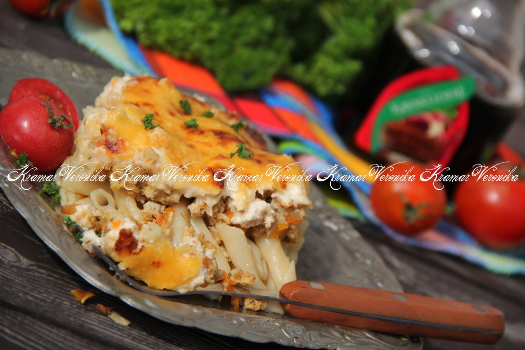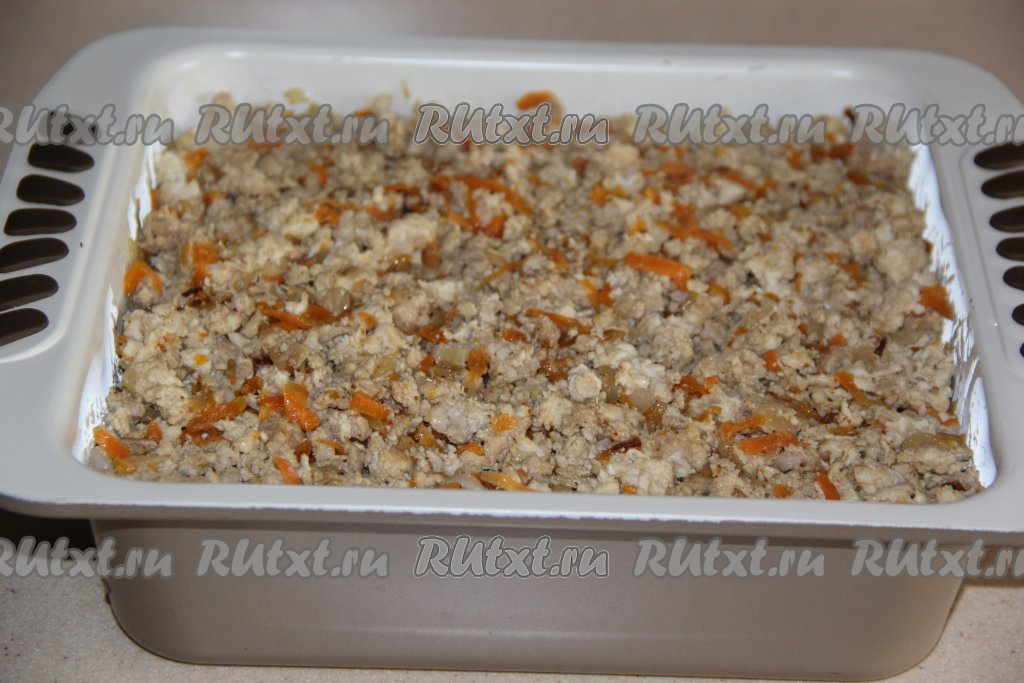 Затем выложить ровным слоем часть обжаренного фарша. Продолжать выкладывать ленивую лазанью слоями, чередуя макароны и фарш. У меня получилось по три слоя макарон и фарша. Верхним должен быть слой из фарша.