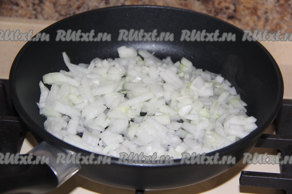 Мелко нарезать очищенную луковицу. В сковороду влить растительное масло, выложить лук и обжарить его, периодически перемешивая, до прозрачности на среднем огне.