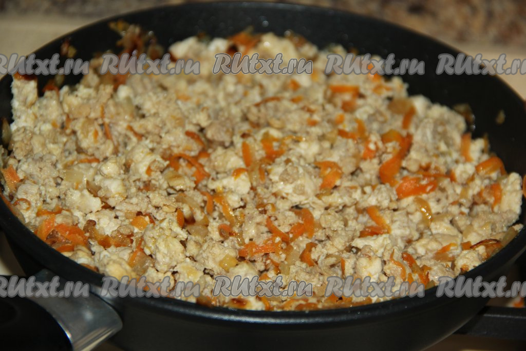 Обжарить фарш с морковкой и луком в течение 15 минут на среднем огне, время от времени перемешивая и разбивая комочки мяса.