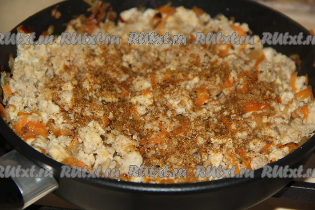 Затем посолить, добавить специи, перемешать и снять обжаренный фарш с огня.