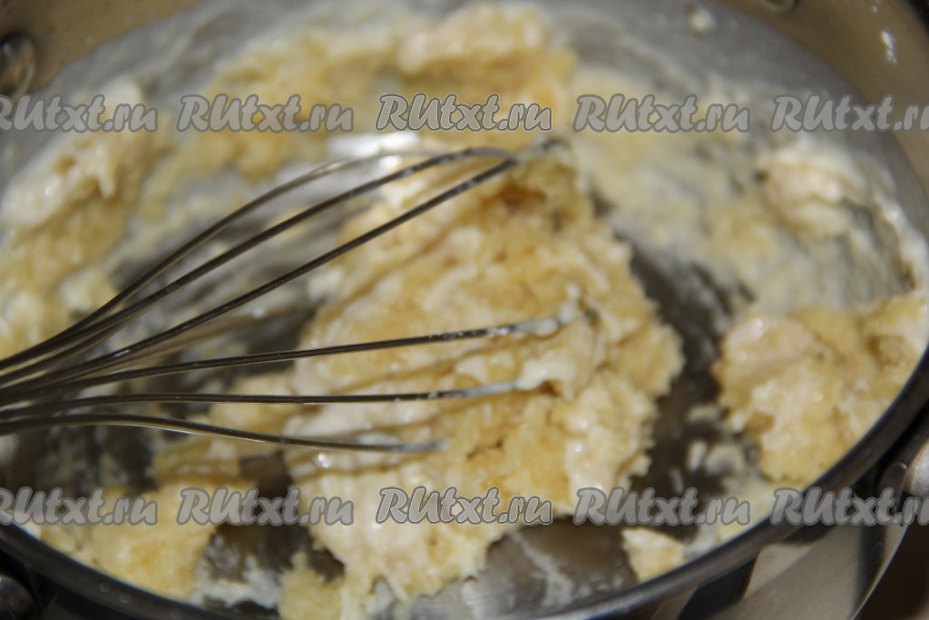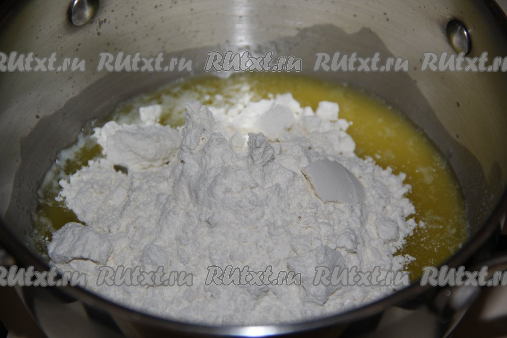Быстро и тщательно перемешать муку с маслом, как бы заваривая муку.