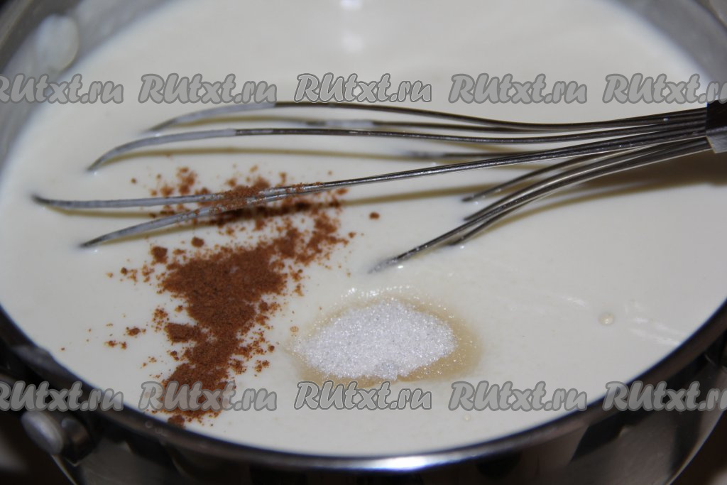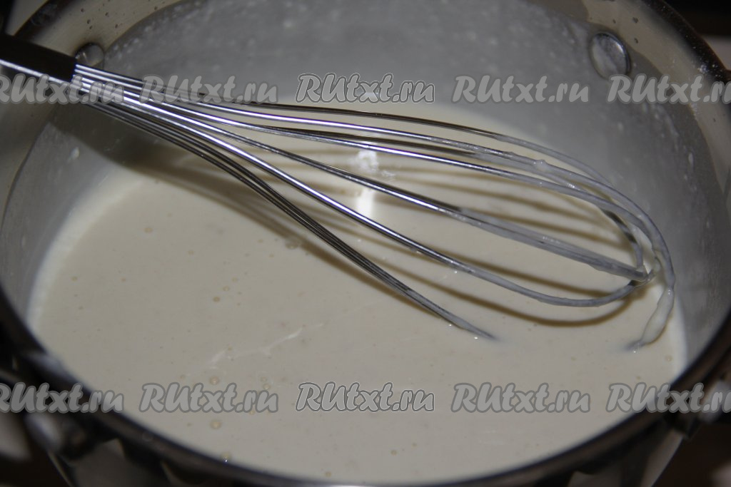 Затем в смесь масла и муки маленькими порциями добавлять молоко, тщательно перемешивая венчиком.