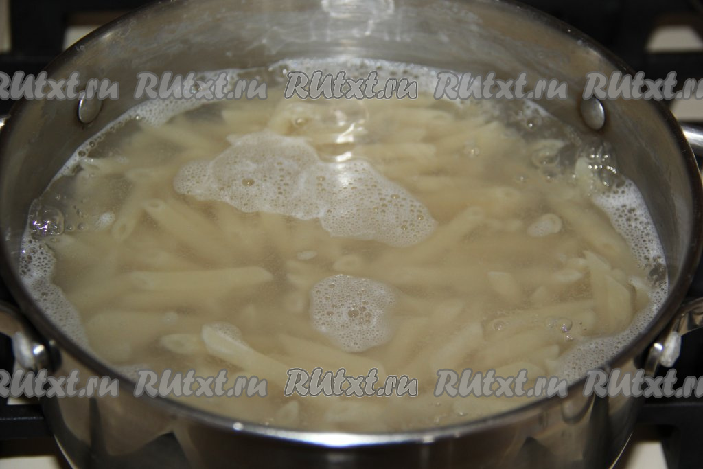 280-300 грамм сухих макарон выложить в кипящую воду, дать закипеть, а затем отварить их на небольшом огне до полуготовности (на это потребуется 3-4 минуты с момента закипания) и откинуть на дуршлаг, чтобы стекла вода. Для приготовления лазаньи понадобится грамм 700 макаронных изделий, отваренных до полуготовности.