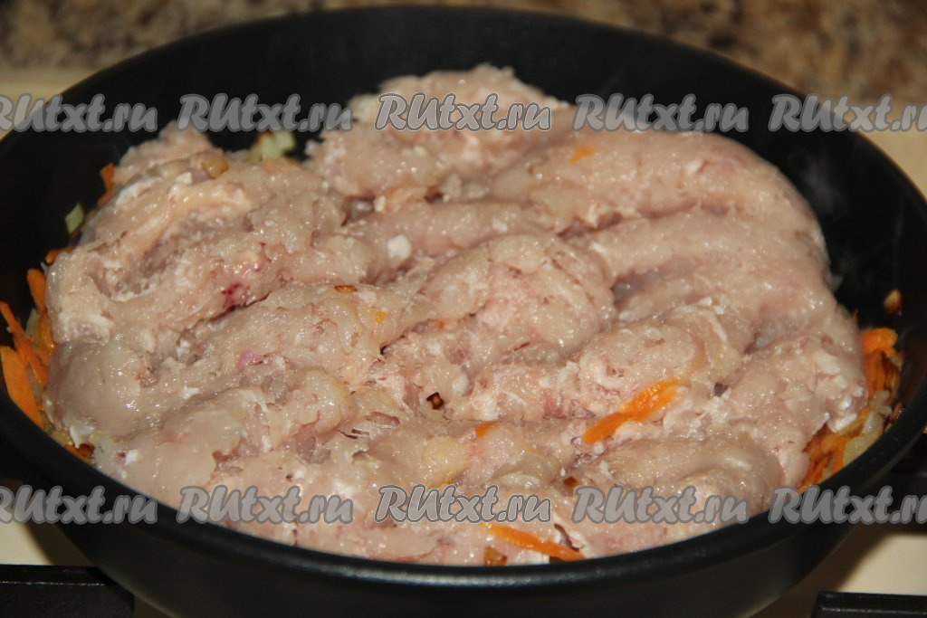 В сковороду с обжаренными овощами выложить мясной фарш.