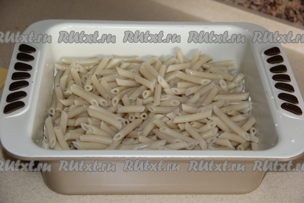Собрать ленивую лазанью, для этого на дно формы для запекания выложить ровным слоем часть макарон, отваренных до полуготовности.