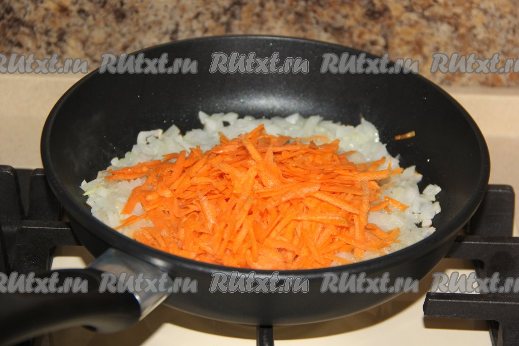 Морковь почистить и натереть на тёрке. Добавить морковь в сковороду и обжарить с луком в течение 5 минут, не забывая перемешивать овощи.
