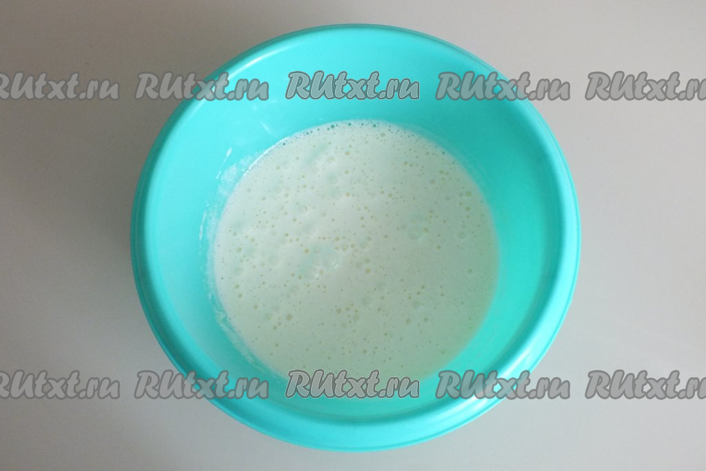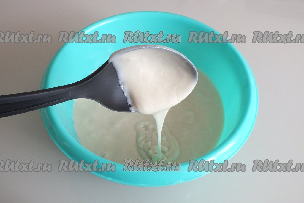 Взбейте тесто миксером до однородного состояния. Тесто должно получиться в меру густым, медленно стекающим с ложки, оно будет чуть гуще блинного теста.