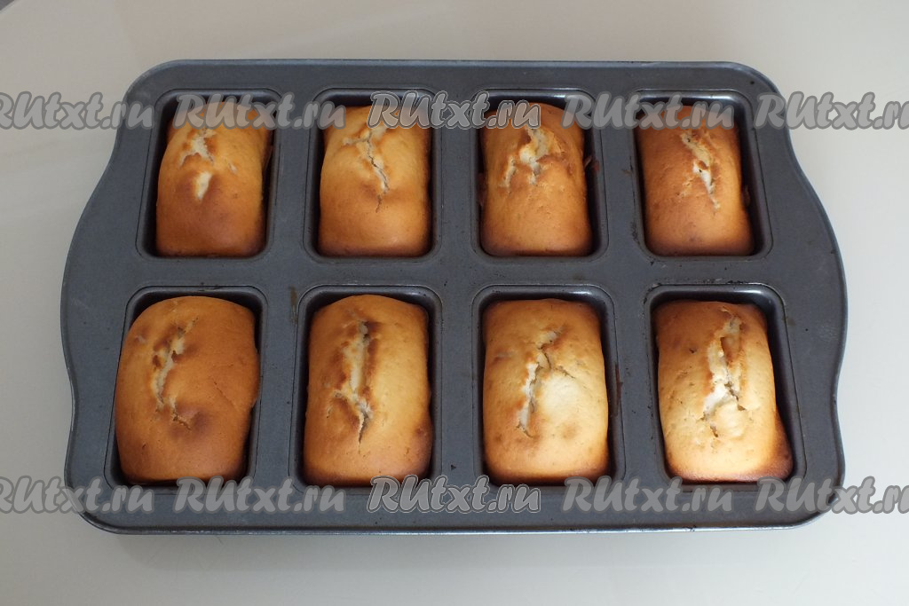 По истечении времени проверьте готовность кексов, проколов выпечку сухой деревянной шпажкой (шпажка и после прокалывания кексов должна остаться сухой). Достаньте выпечку из духовки.