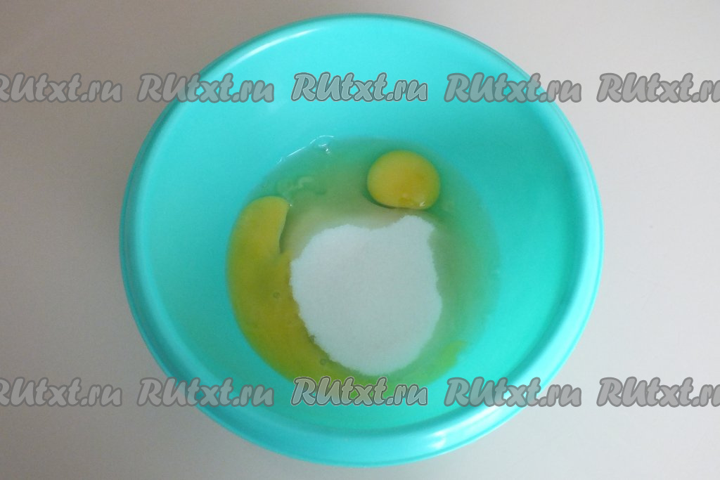 В миске соедините яйца и сахар, взбейте миксером в пышную массу.