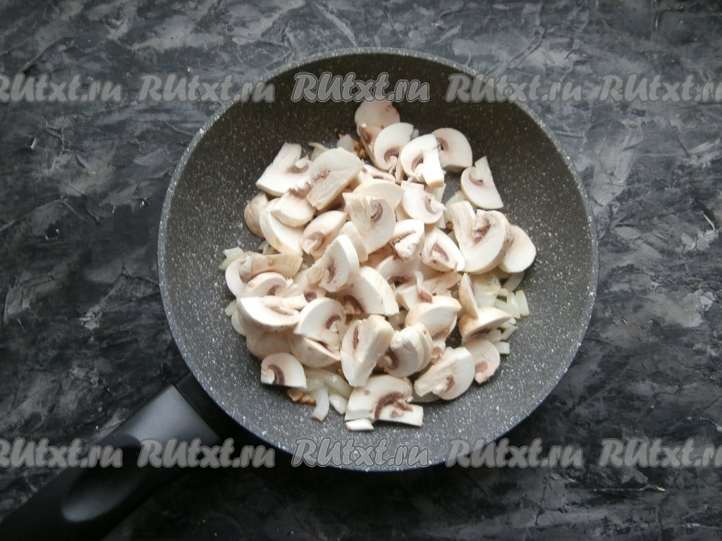 Лук обжарить на среднем огне до мягкости (в течение 3-5 минут), добавить нарезанные не слишком тонкими пластинами шампиньоны.