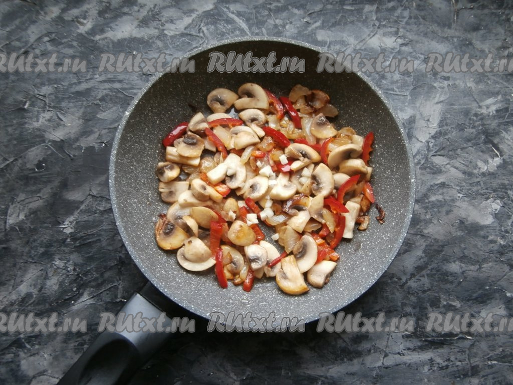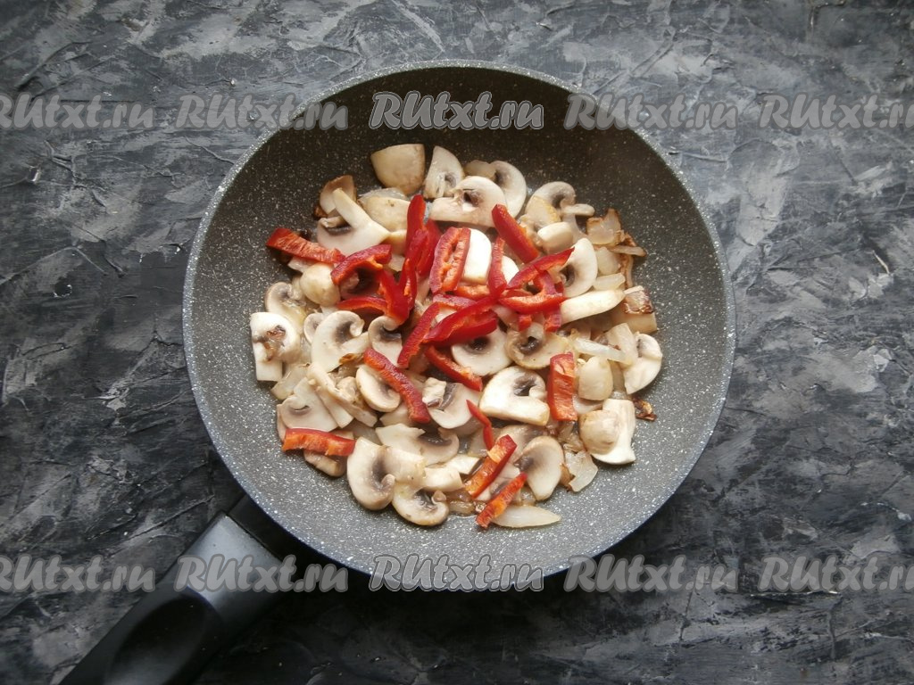 Грибы с луком обжаривать в течение 3-4 минут, затем добавить нарезанный соломкой болгарский перец.