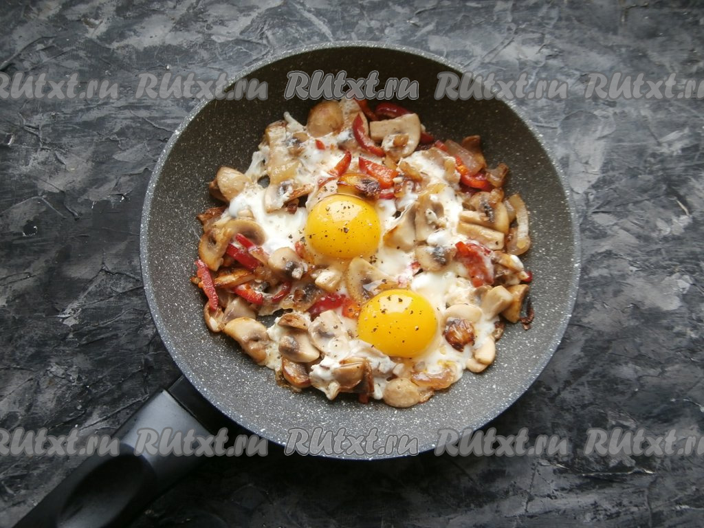 Вбить в сковороду яйца, посолить по вкусу и поперчить, прикрыть сковороду крышкой и на медленном огне выдержать яичницу с шампиньонами и луком 3-4 минуты.