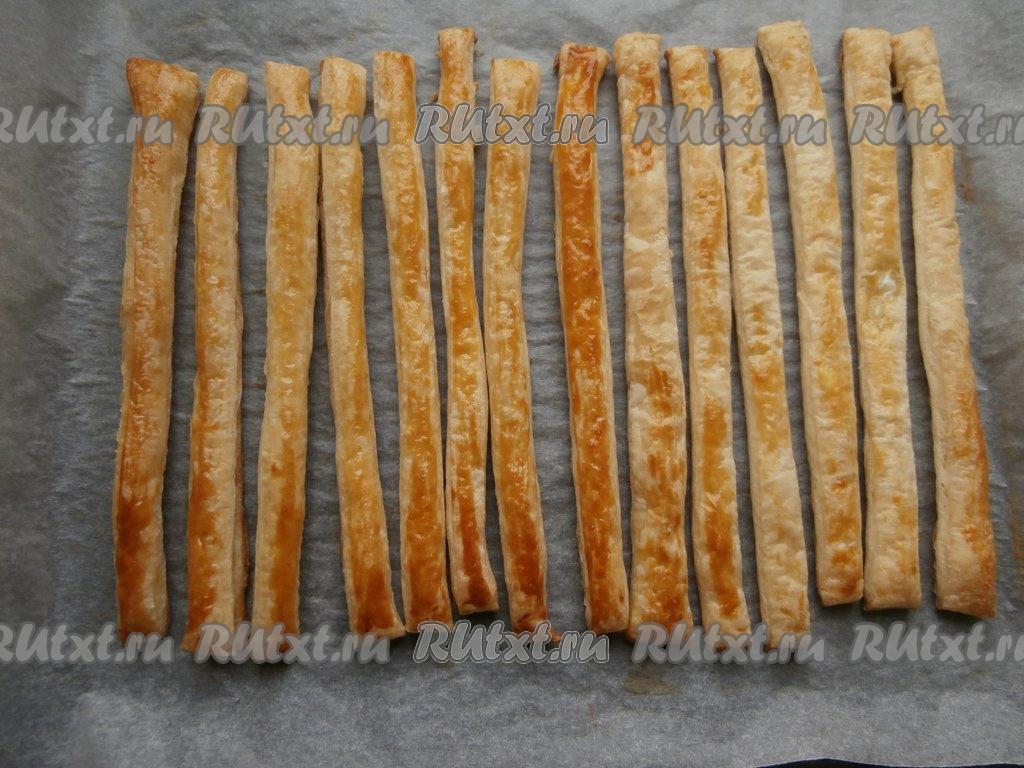 Пласты слоёного теста чуть разморозить и немного раскатать скалкой. Нарезать тесто на 14 узких длинных полос (у меня длина полос - 20-22 см, ширина - 1,5 см), выложить их на противень, застеленный пергаментом.