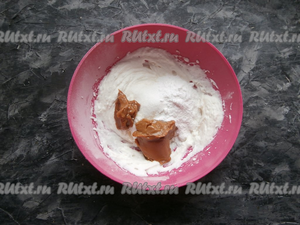 Взбить сметану миксером в течение 2-3 минут, пока она не станет достаточно густой, добавить варёное сгущённое молоко, ванильный сахар и сахарную пудру.