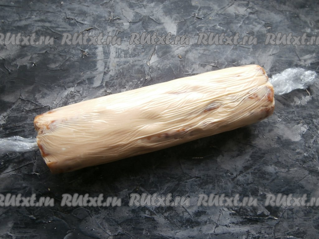 Далее тортик в виде полена плотно завернуть в пищевую плёнку, края которой закрутить (или перевязать). Отправить торт в холодильник часов на 6-7.