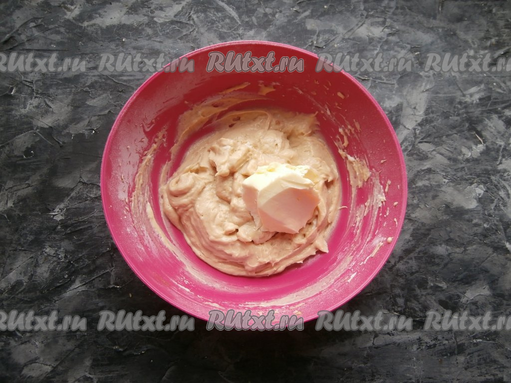 Далее добавить предварительно размягчённое в течение 1 часа при комнатной температуре сливочное масло и вмешать его миксером в крем.