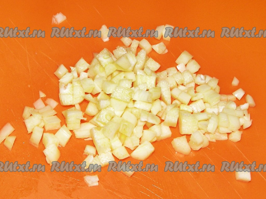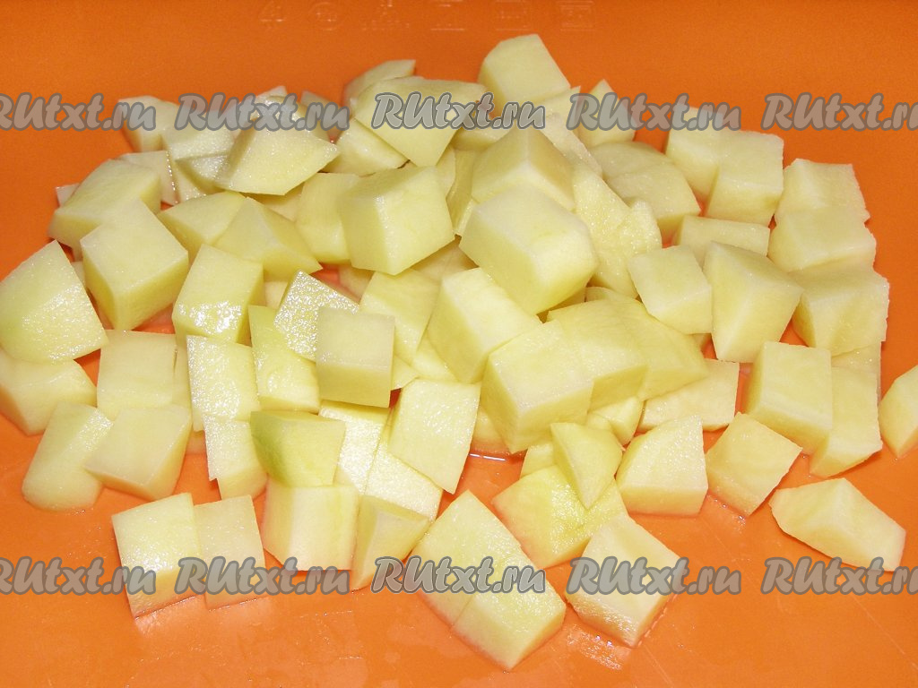 Картофель чистим, нарезаем кубиками среднего размера и на время кладём в холодную воду, чтобы избавиться от лишнего крахмала.