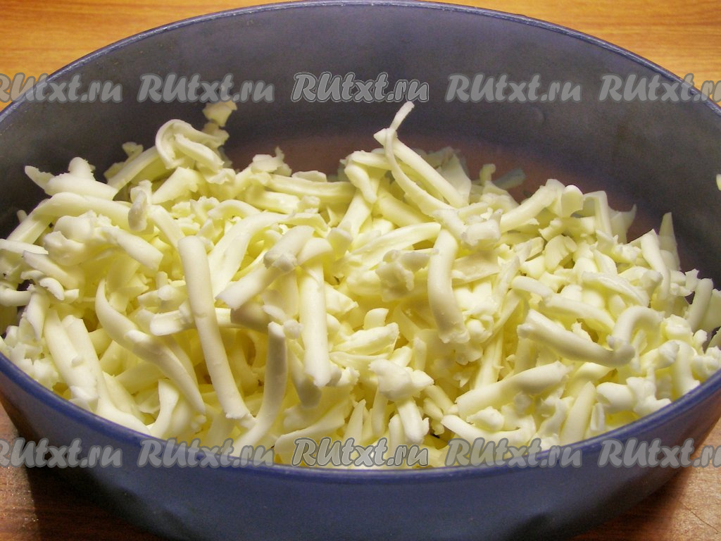 Плавленый сырок натираем на крупной тёрке. Чтобы он легче натирался, его можно заранее минут на 20 положить в морозилку.