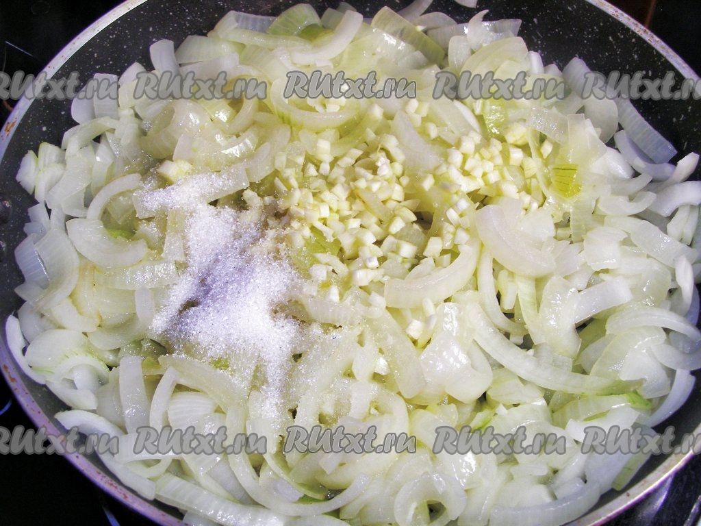 Добавляем нарезанный чеснок, сахар и перемешиваем. Уменьшаем огонь, накрываем сковороду крышкой и тушим лук 30 минут, помешивая время от времени.