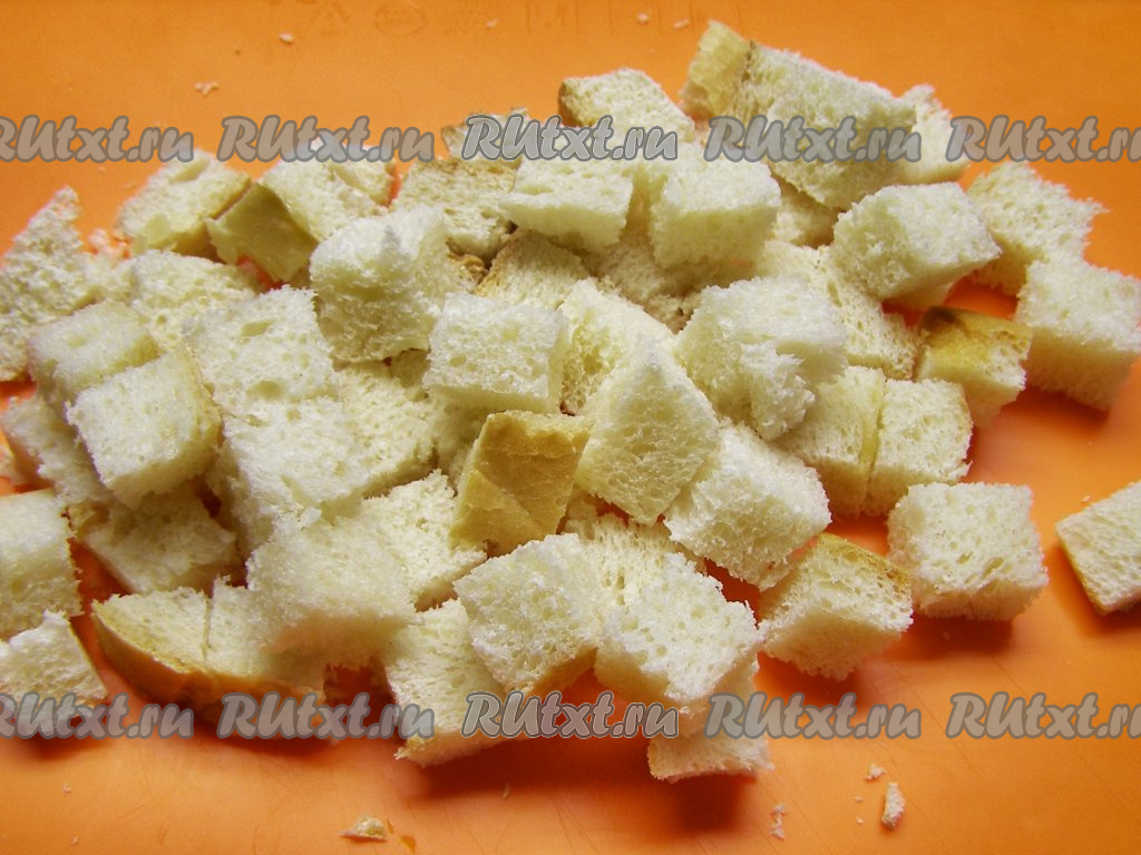 Для подачи лукового супа можно дополнительно пожарить гренки. Белый хлеб нарезаем кубиками.