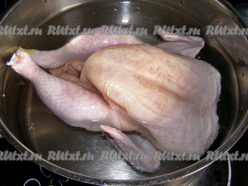 Сначала сварим бульон. Я для лукового супа предпочитаю готовить насыщенный куриный бульон, поэтому варю всю курицу целиком (вес курочки, примерно, 1,2 килограмма), вы же можете использовать 1/4 часть от курицы (к примеру, окорочок весом 300-400 грамм). Курицу моем холодной водой, затем перекладываем в кастрюлю и заливаем чистой холодной водой так, чтобы она полностью покрывала курицу. Добавляем соль и ставим на сильный огонь.