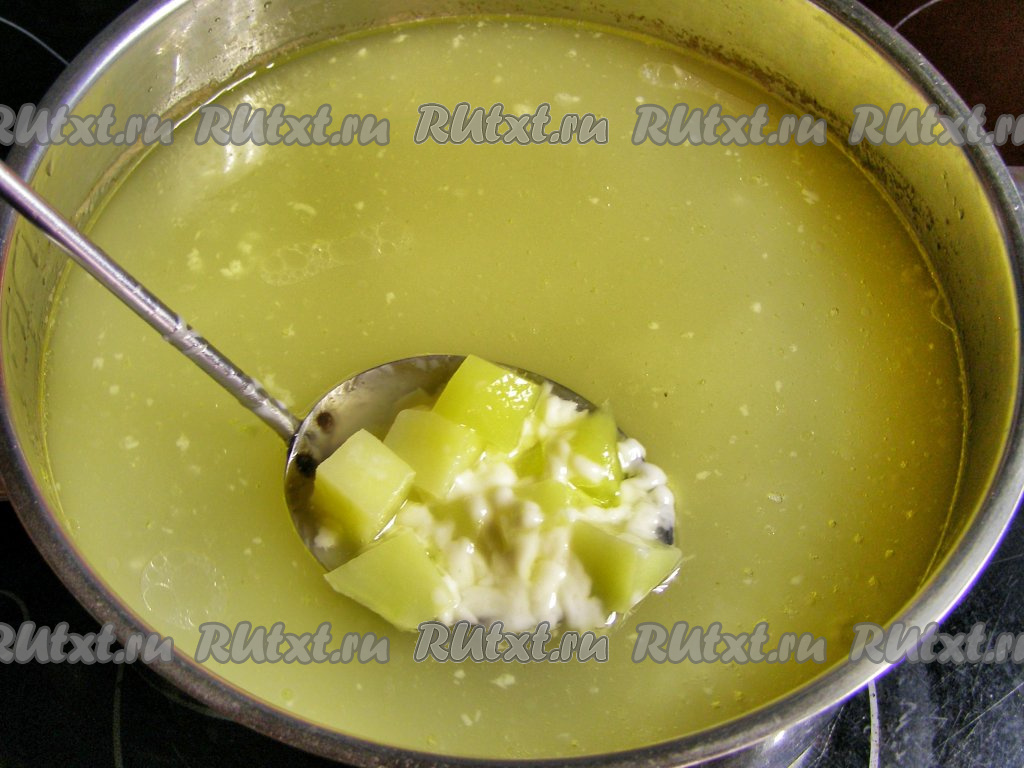 Когда картошка станет мягкой, кладём в кастрюлю натёртый плавленный сыр и варим, помешивая, до полного растворения сыра.