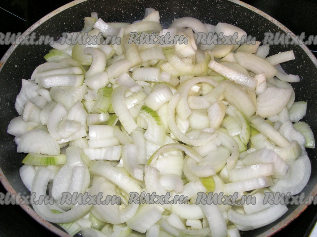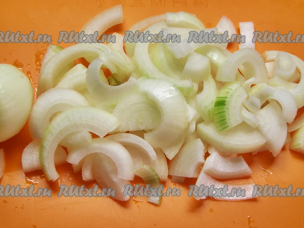 Лук очищаем от шелухи и режем полукольцами шириной 5-7 мм.