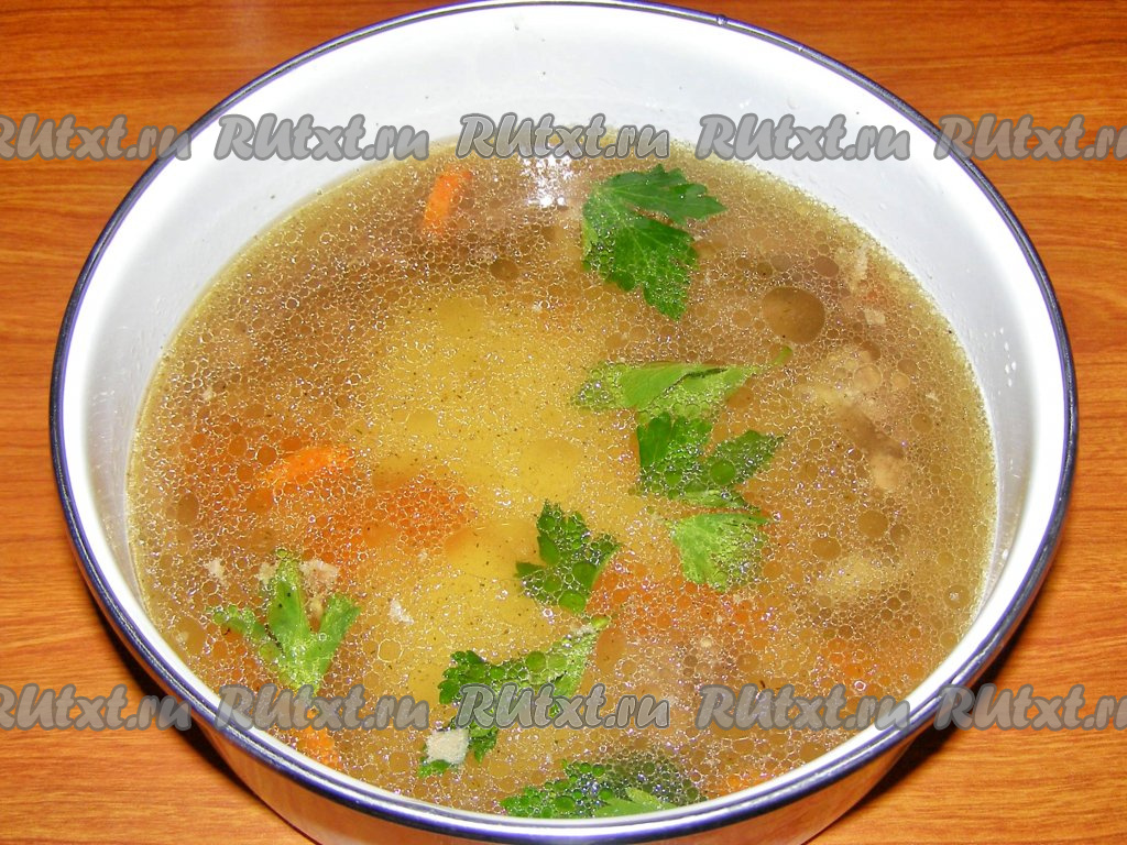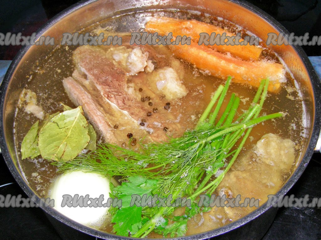 За 30 минут до окончания варки добавляем в бульон соль, очищенную морковь, луковицу (шелуху полностью снимать необязательно, можно убрать только верхнюю шелуху), лавровые листья, чёрный перец горошком, а также веточки петрушки и укропа.