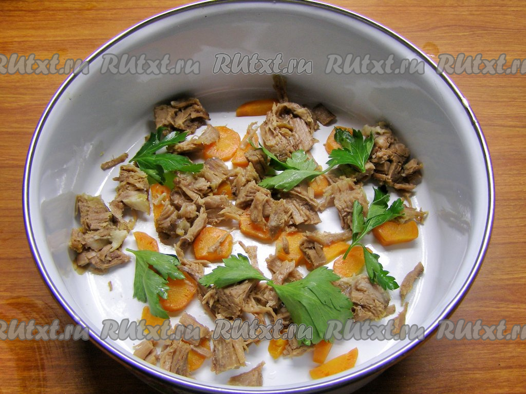 Через 30 минут снимаем кастрюлю с огня, вынимаем говядину, ножки и морковь. Оставляем их немного остыть. Лук, веточки зелени, лавровые листья и перец выбрасываем. Процеживаем бульон через мелкое сито (или марлю, сложенную вдвое).