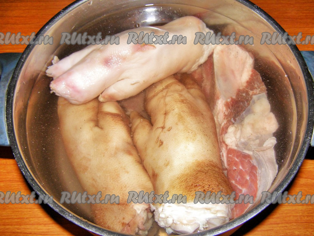 Сначала подготовим свиные ножки, если на них осталась щетина, подпалите её зажигалкой. Тщательно моем ножки щёткой, чтобы удалить всю грязь. Можно даже замочить их на пару часов в холодной воде. Говядину просто ополаскиваем холодной водой. Кладём мясо и ножки в глубокую кастрюлю, заливаем холодной водой и ставим на сильный огонь. В процессе закипания будет появляться пена, которую лучше убирать с помощью шумовки. Когда вода закипит, уменьшаем огонь и варим свиные ножки с говядиной в течение 10-15 минут.