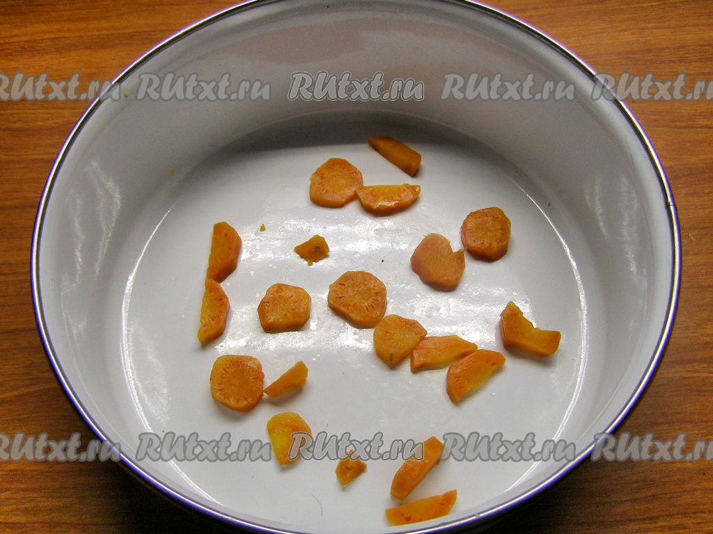 Первым слоем раскладываем по формам нарезанную морковь.