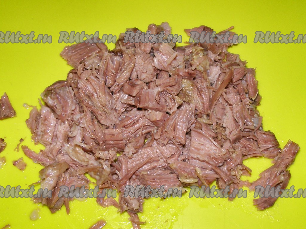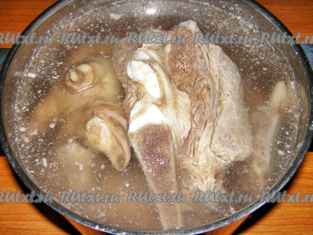Мясо говядины отделяем от костей и нарезаем на небольшие кусочки. По желанию, можно добавить мясо свиных ног.