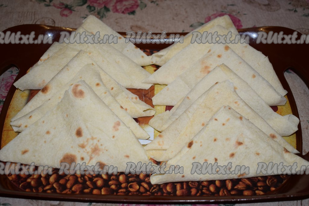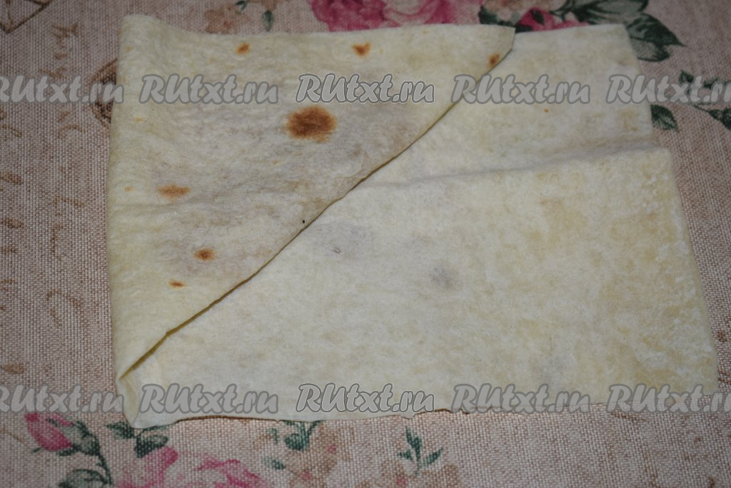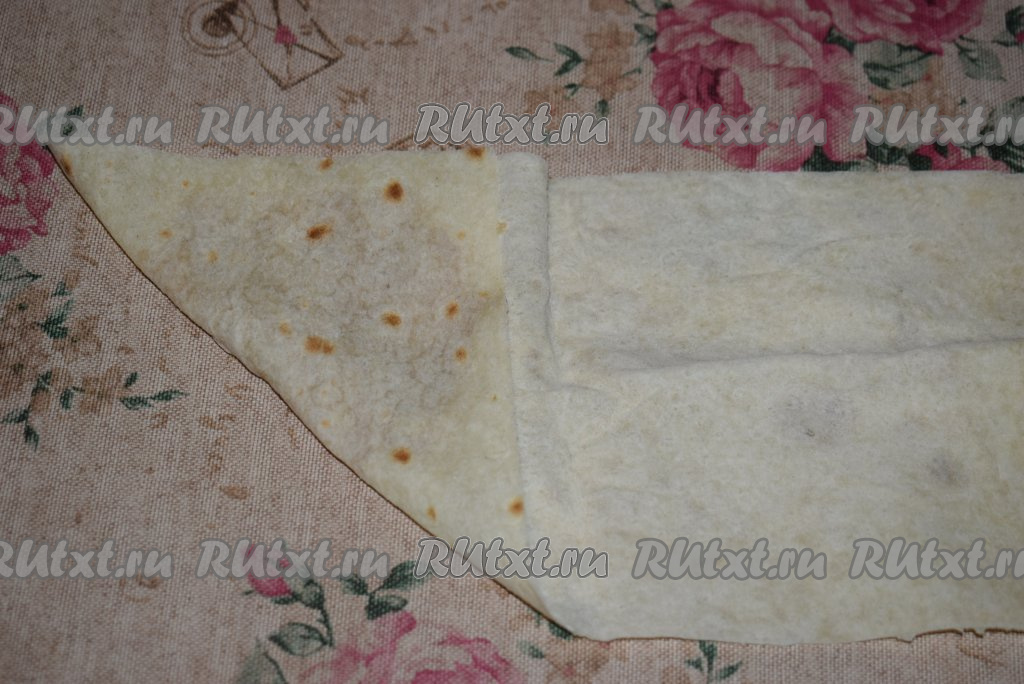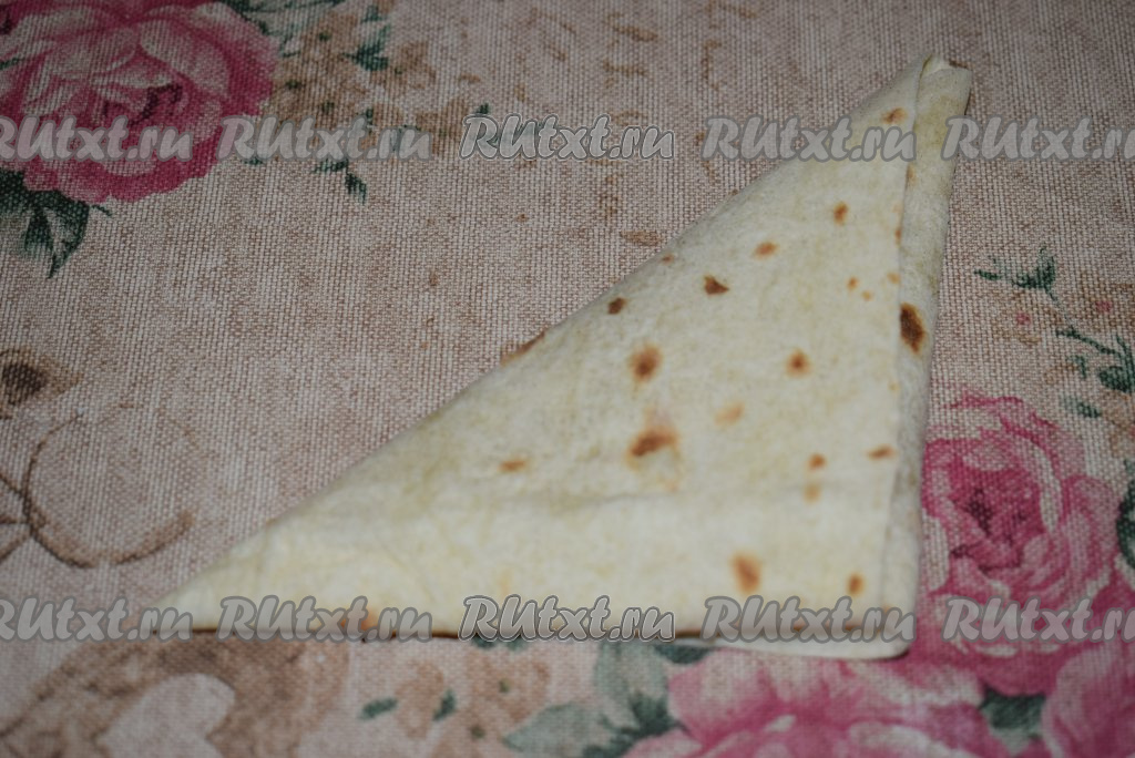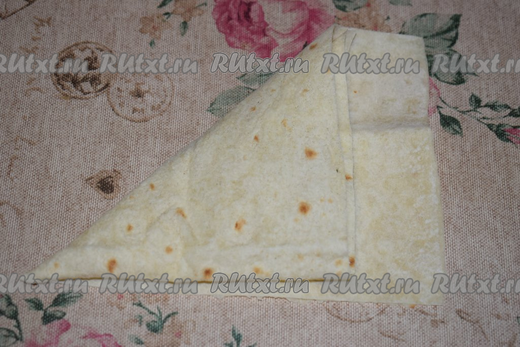 Далее оставшуюся справа нетронутую часть лаваша заправляем внутрь треугольника, и получаем ровный треугольник (см. фото).