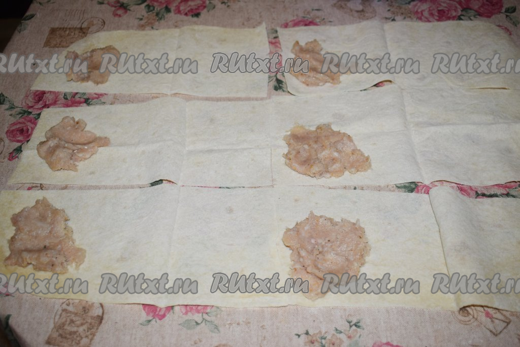 Затем разрезаем полосы пополам. На левую сторону каждой заготовки выкладываем по 1,5-2 чайных ложки начинки из фарша и слегка её разравниваем.