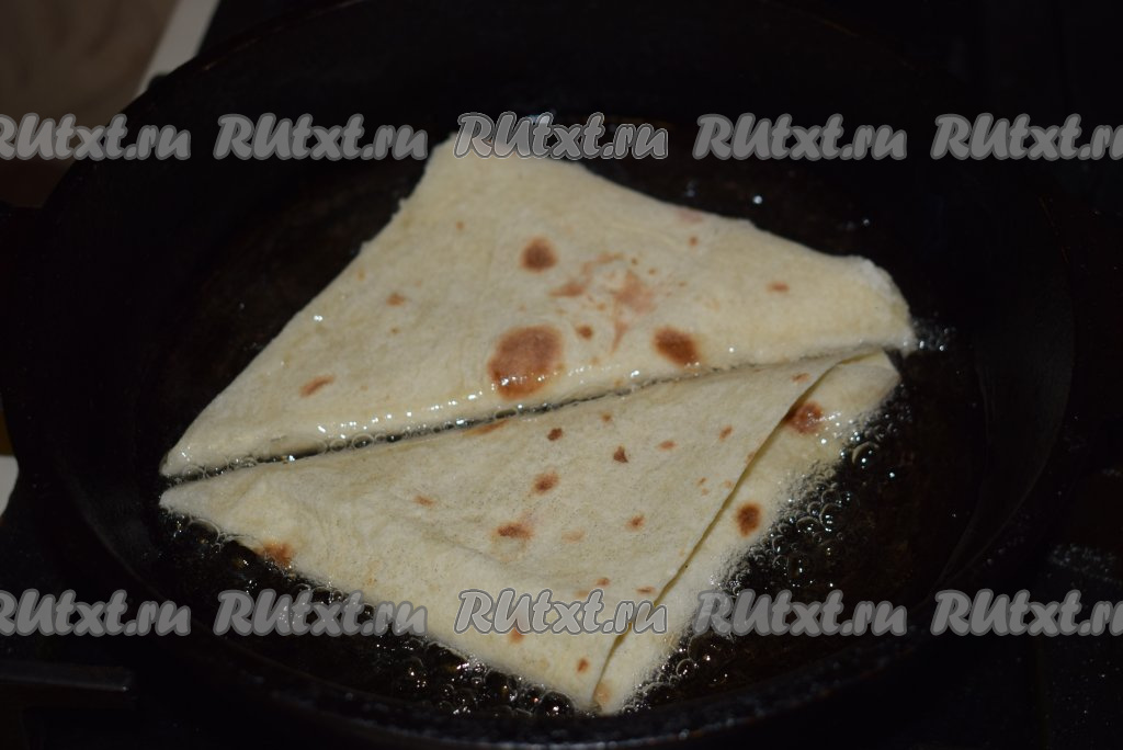 Далее разогреваем сковороду и выливаем в неё растительное масло. Ждём, когда масло раскалится, делаем огонь средним и приступаем к жарке наших чебуреков из лаваша с начинкой из мясного фарша. Жарим сначала с одной стороны, примерно, 4 минуты (до подрумянивания).