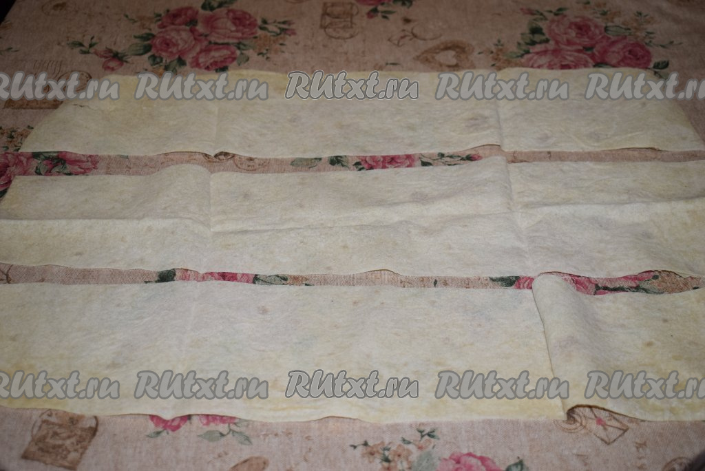 Лаваш разрезаем вдоль на 3, примерно, равные полосы. Аналогично на полосы разрезаем и второй лаваш.