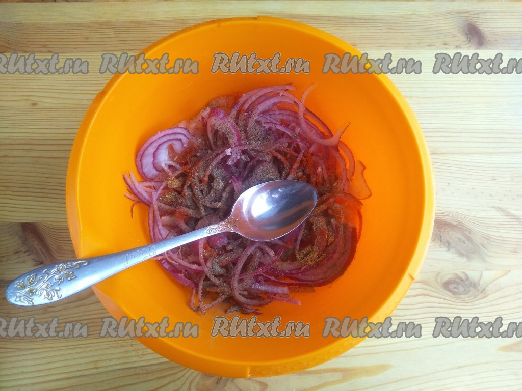 Добавить соль, сахар, паприку, хмели-сунели и уксус, перемешать филе с луком и специями.