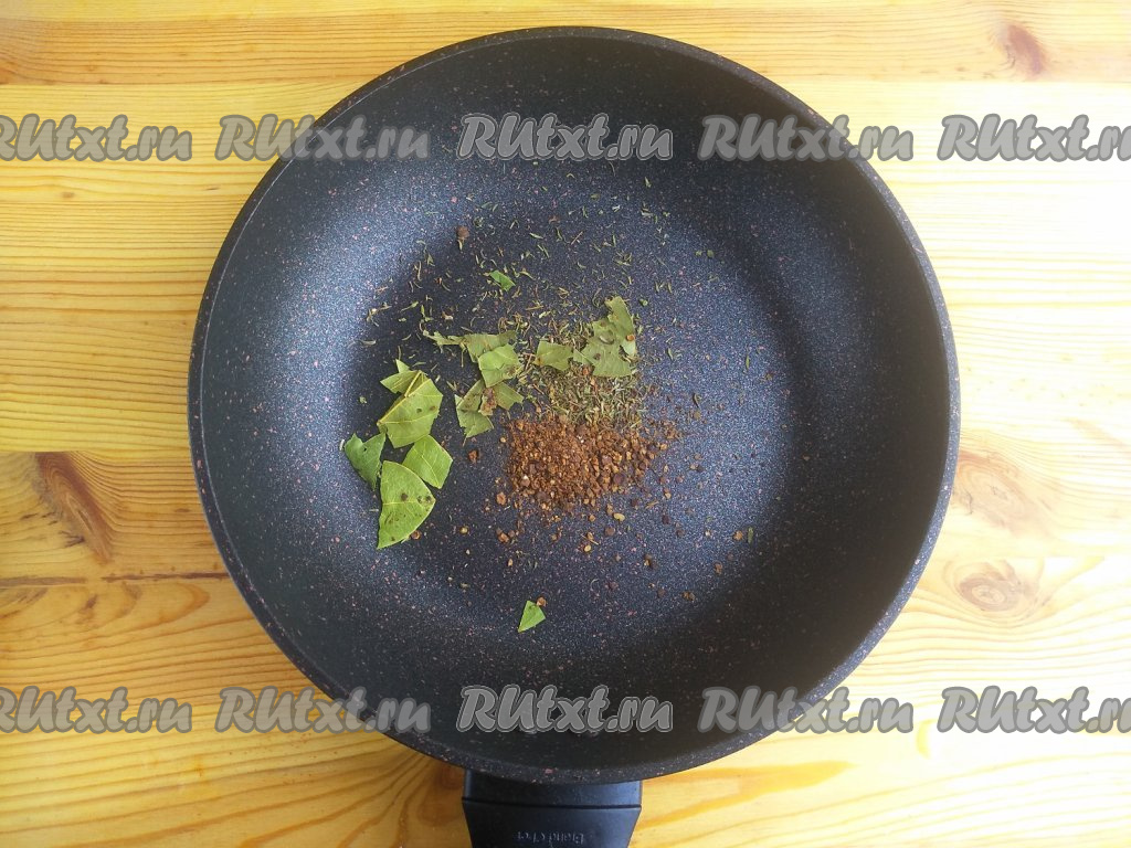 Горошинки душистого перца и можжевельника растолочь в ступке, лавровый лист разломать руками, выложить их на сковороду, добавить растительное масло, нагревать на среднем огне до потемнения специй (в течение 5 минут).