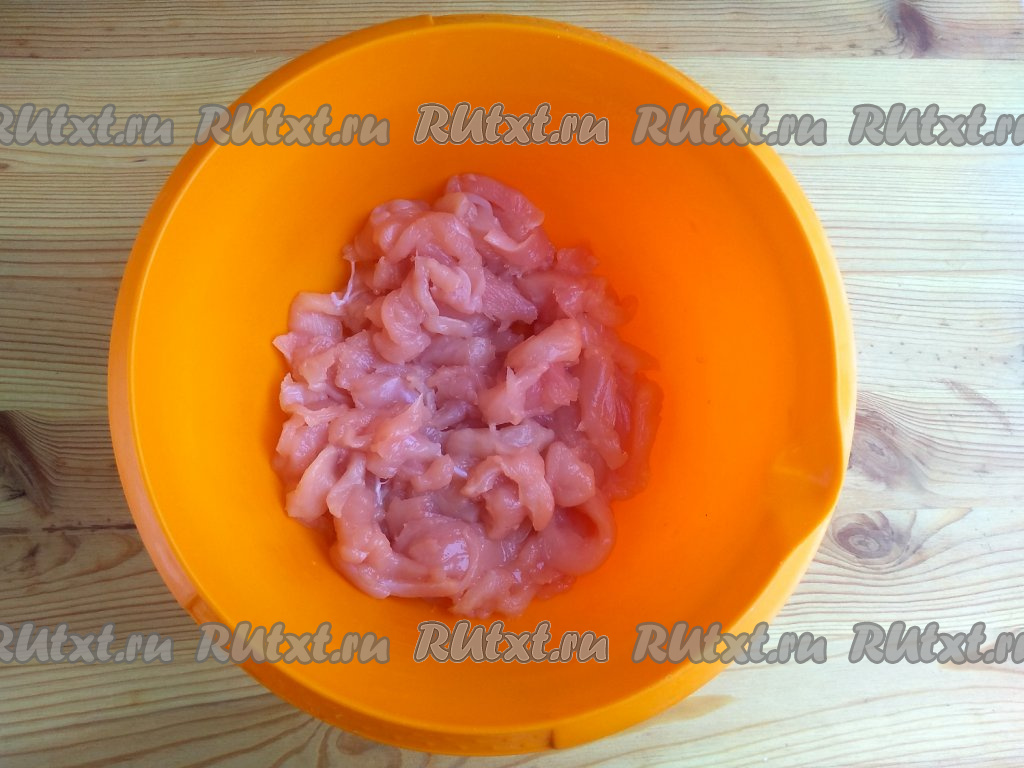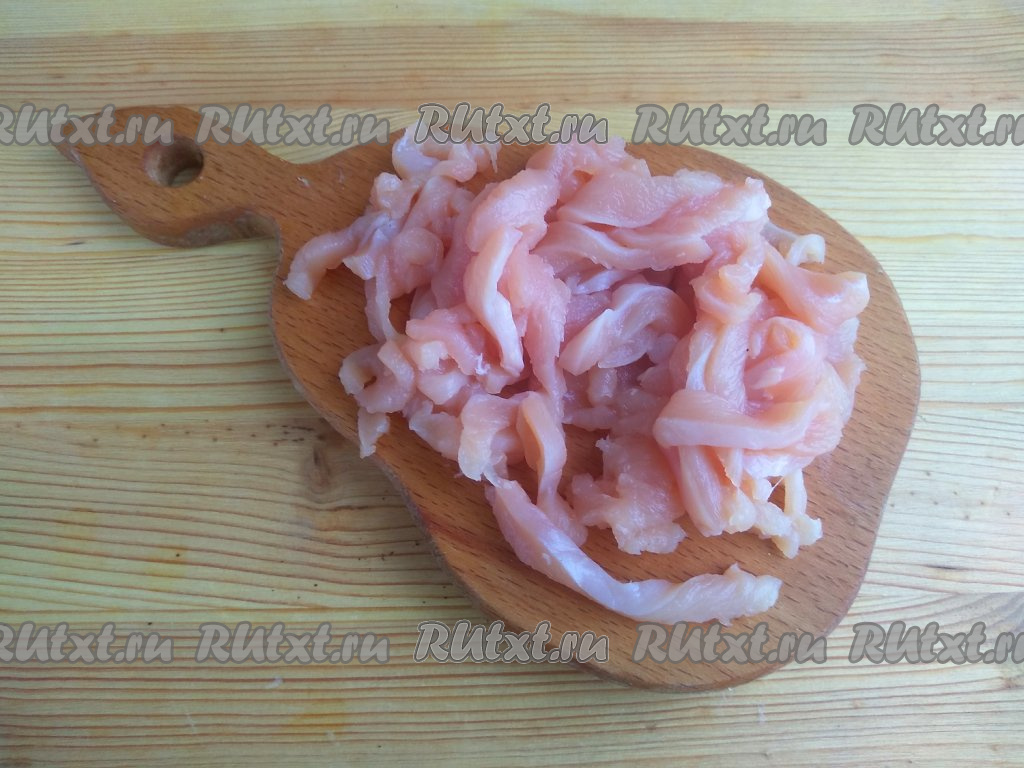 Куриное филе промыть в проточной воде, обсушить и нарезать тонкой соломкой.