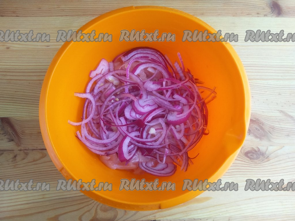 Лук очистить от шелухи, нарезать тонкими полукольцами и выложить поверх мяса.
