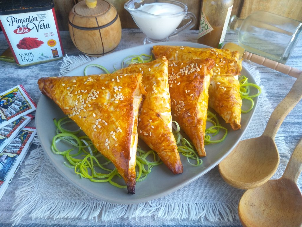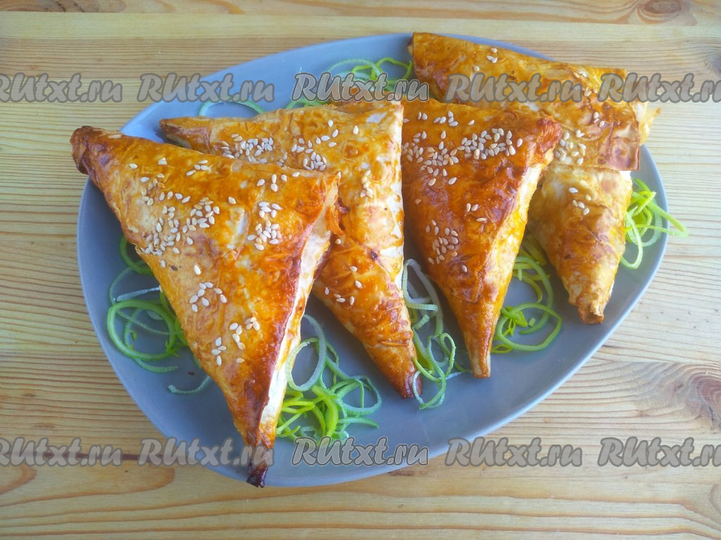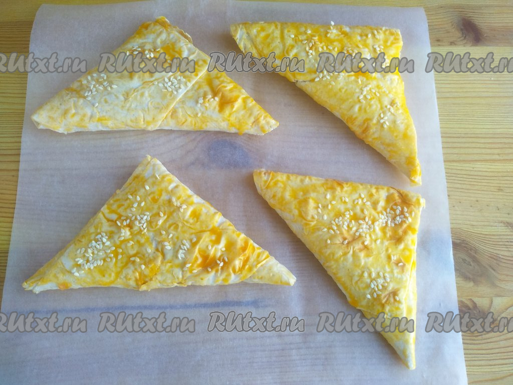 Аналогично сформировать остальные изделия в виде треугольных конвертов. Смазать наши заготовки самсы желтком, посыпать сверху кунжутом. Выложить на противень, застеленный бумагой для выпечки.