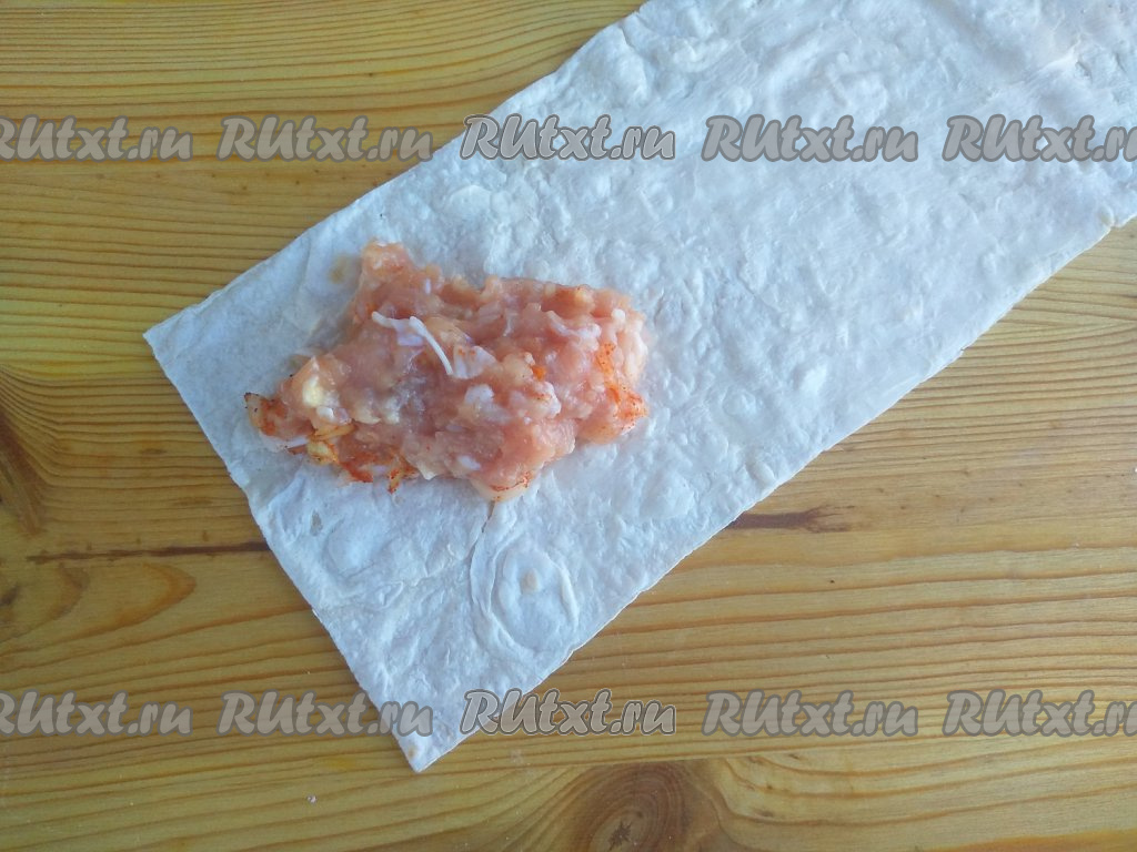 Теперь нужно будет завернуть мясной фарш в полоску лаваша в виде треугольного конверта так, чтобы начинка была запечатана внутри лаваша. Первым делом на край лаваша выложить 1,5 столовые ложки фарша.