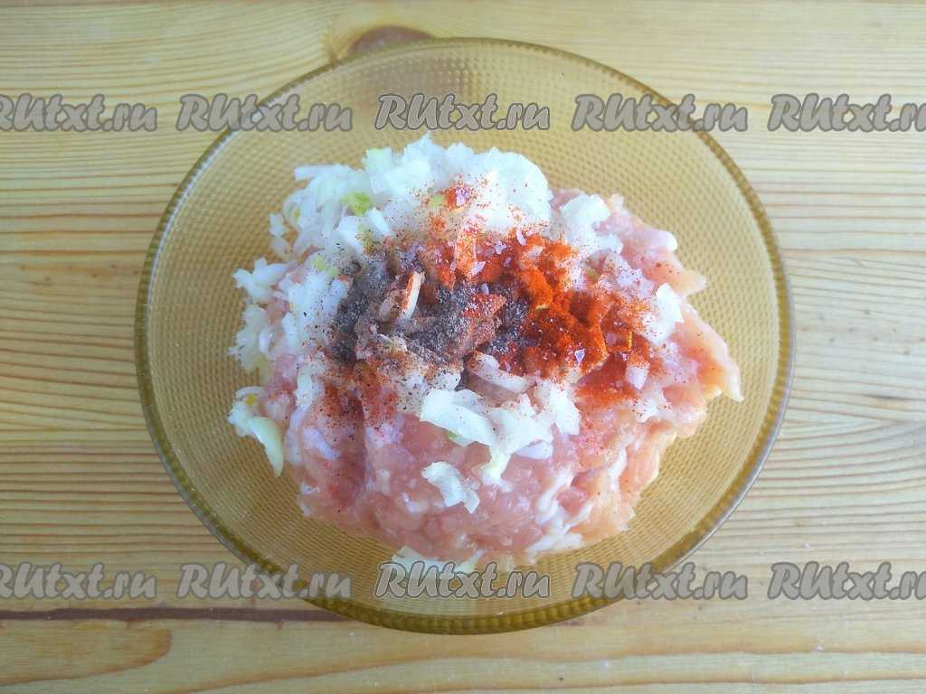 К фаршу с луком добавить специи (я добавила чабрец, паприку), посолить, поперчить и тщательно перемешать фарш.