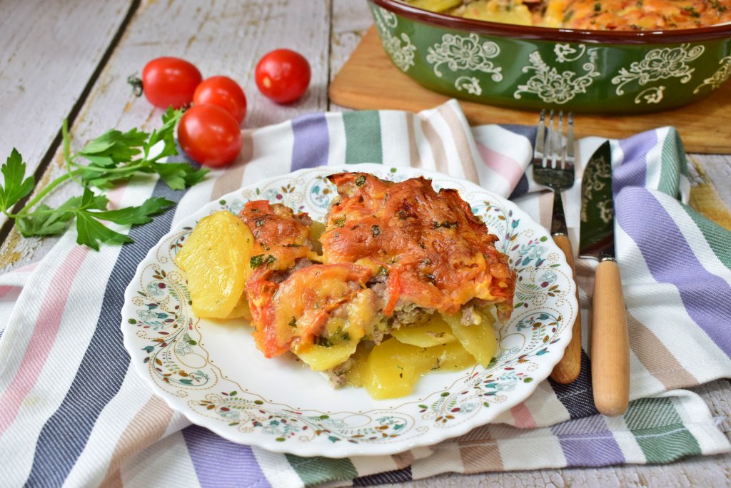 Люблю готовить разнообразные блюда в духовке. Это очень удобно тем, что на подготовку уходит совсем немного времени, а основную работу делает наша помощница - духовка. Сегодня делюсь отличным рецептом запекания картошки, нарезанной кружочками, с фаршем и помидорами под сырной корочкой. Блюдо получается вкусным, аппетитным и сытным, оно прекрасно подойдёт для семейного обеда или ужина!
