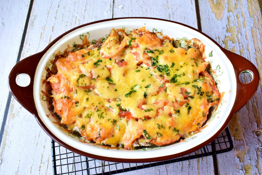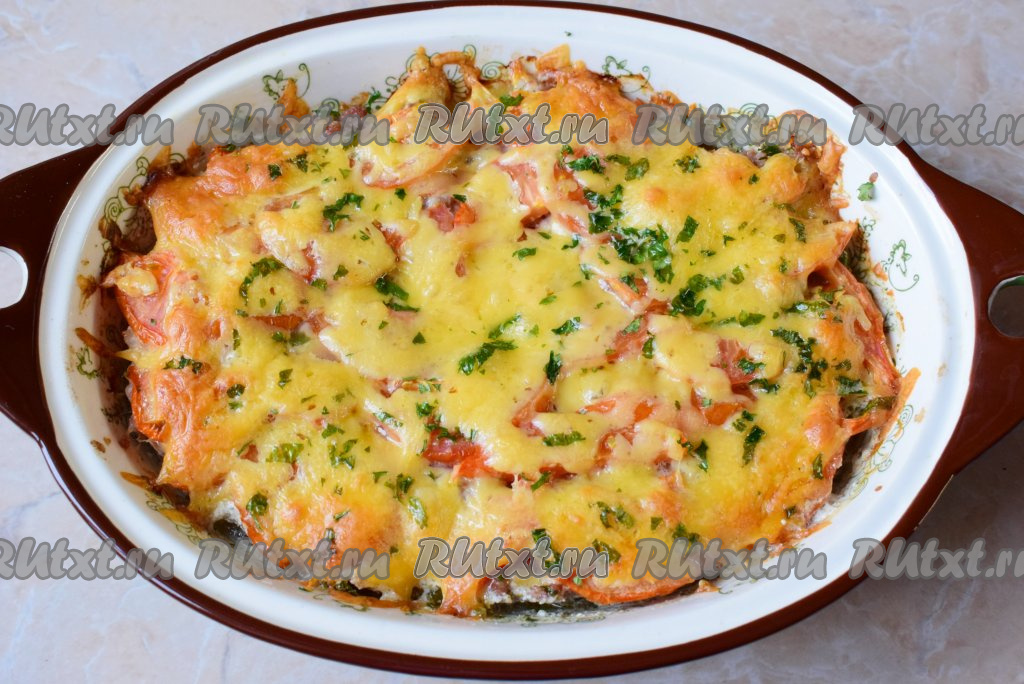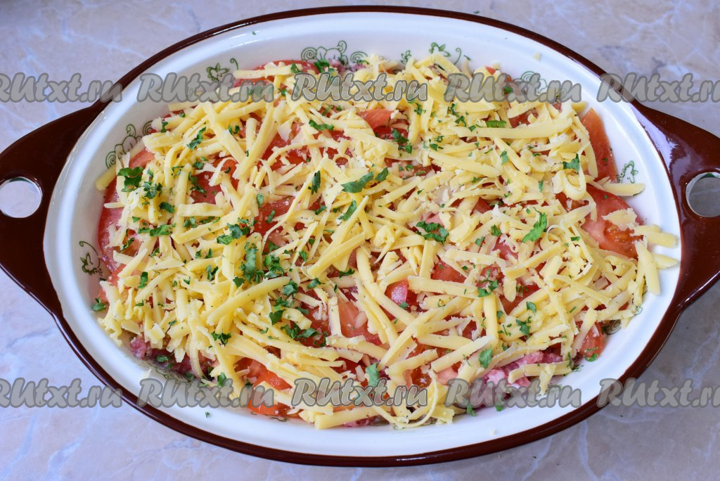 Верх блюда посыпьте сыром, натёртым на терке. По желанию, можно присыпать измельчённой зеленью. Поставьте форму с картошкой, фаршем, помидорами и сыром в духовку, предварительно разогретую до 180 градусов, на 1 час.